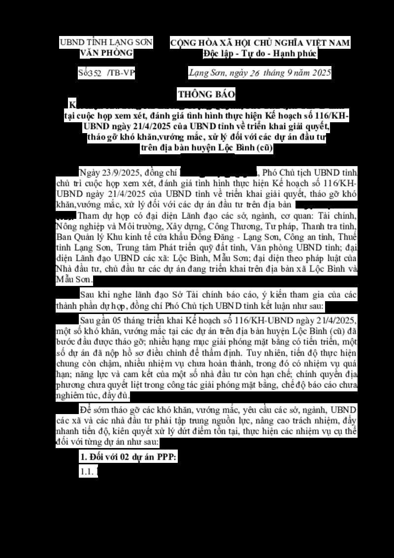 | Tiêu đề văn bản | Kết luận của đồng chí Lương Trọng Quỳnh, Phó Chủ tịch UBND tỉnh tại cuộc họp xem xét, đánh giá tình hình thực hiện Kế hoạch số 116/KH-UBND ngày 21/4/2025 của UBND tỉnh về triển khai giải quyết, tháo gỡ khó khăn,vướng mắc, xử lý đối với các dự án đầu tư trên địa bàn huyện Lộc Bình (cũ) | ||