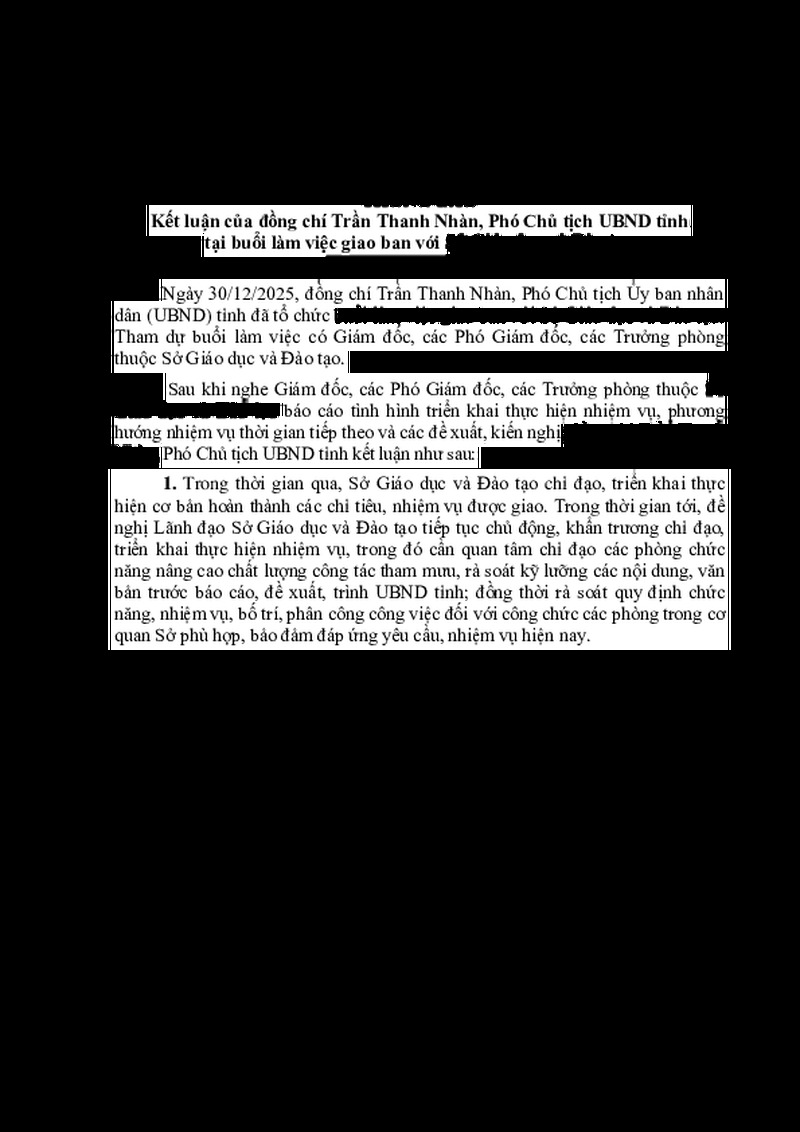 | Tiêu đề văn bản | Kết luận của đồng chí Trần Thanh Nhàn, Phó Chủ tịch UBND tỉnh tại buổi làm việc giao ban với Sở Giáo dục và Đào tạo | ||