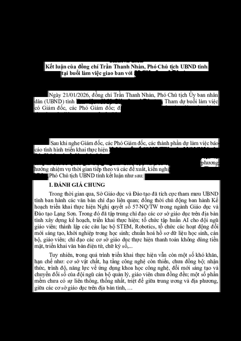 | Tiêu đề văn bản | Kết luận của đồng chí Trần Thanh Nhàn, Phó Chủ tịch UBND tỉnh tại buổi làm việc giao ban với Sở Giáo dục và Đào tạo | ||