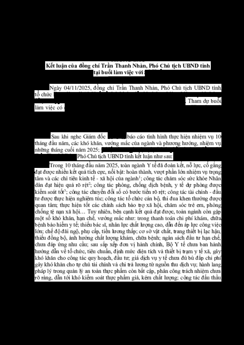 | Tiêu đề văn bản | Kết luận của đồng chí Trần Thanh Nhàn, Phó Chủ tịch UBND tỉnh tại buổi làm việc với Sở Y tế | ||
