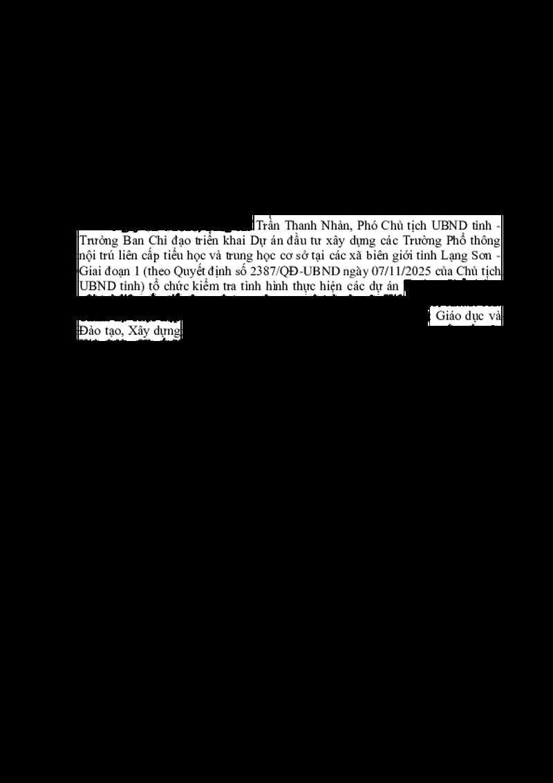 | Tiêu đề văn bản | Kết luận của đồng chí Trần Thanh Nhàn, Phó Chủ tịch UBND tỉnh tại cuộc kiểm tra tình hình thực hiện các dự án Trường Phổ thông nội trú liên cấp tiểu học và trung học cơ sở Kiên Mộc, Khuất Xá | ||