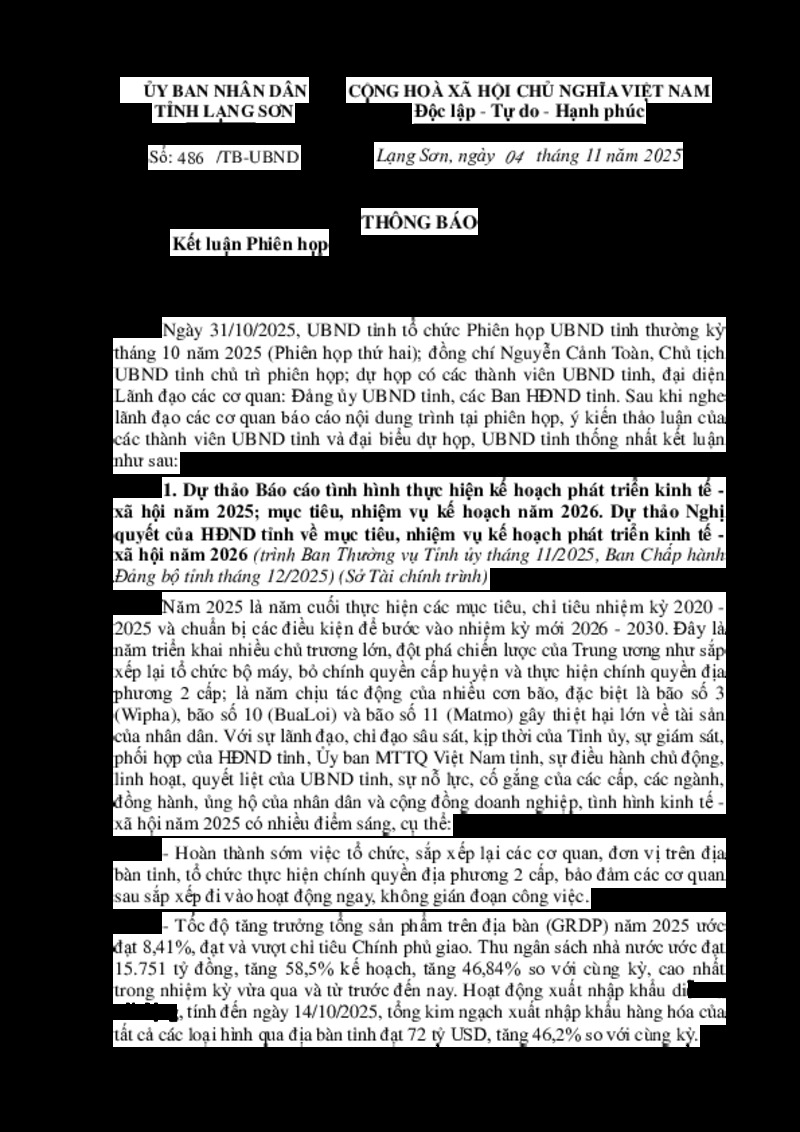 | Tiêu đề văn bản | Kết luận Phiên họp UBND tỉnh thường kỳ tháng 10 năm 2025 (Phiên thứ hai) | ||