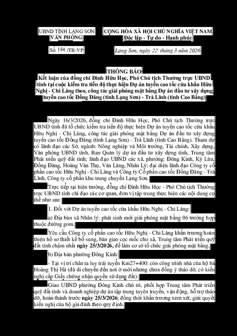 | Tiêu đề văn bản | Thông báo kết luận của đồng chí Đinh Hữu Học, Phó Chủ tịch Thường trực UBND tỉnh tại cuộc kiểm tra tiến độ thực hiện Dự án tuyến cao tốc cửa khẩu Hữu Nghị - Chi Lăng theo, công tác giải phóng mặt bằng Dự án đầu tư xây dựng tuyến cao tốc Đồng Đăng (tỉnh Lạng Sơn) - Trà Lĩnh (tỉnh Cao Bằng) | ||