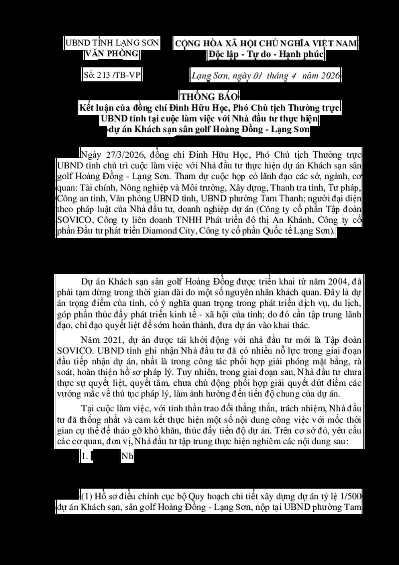 | Tiêu đề văn bản | Thông báo kết luận của đồng chí Đinh Hữu Học, Phó Chủ tịch Thường trực UBND tỉnh tại cuộc làm việc với Nhà đầu tư thực hiện dự án Khách sạn sân golf Hoàng Đồng - Lạng Sơn | ||