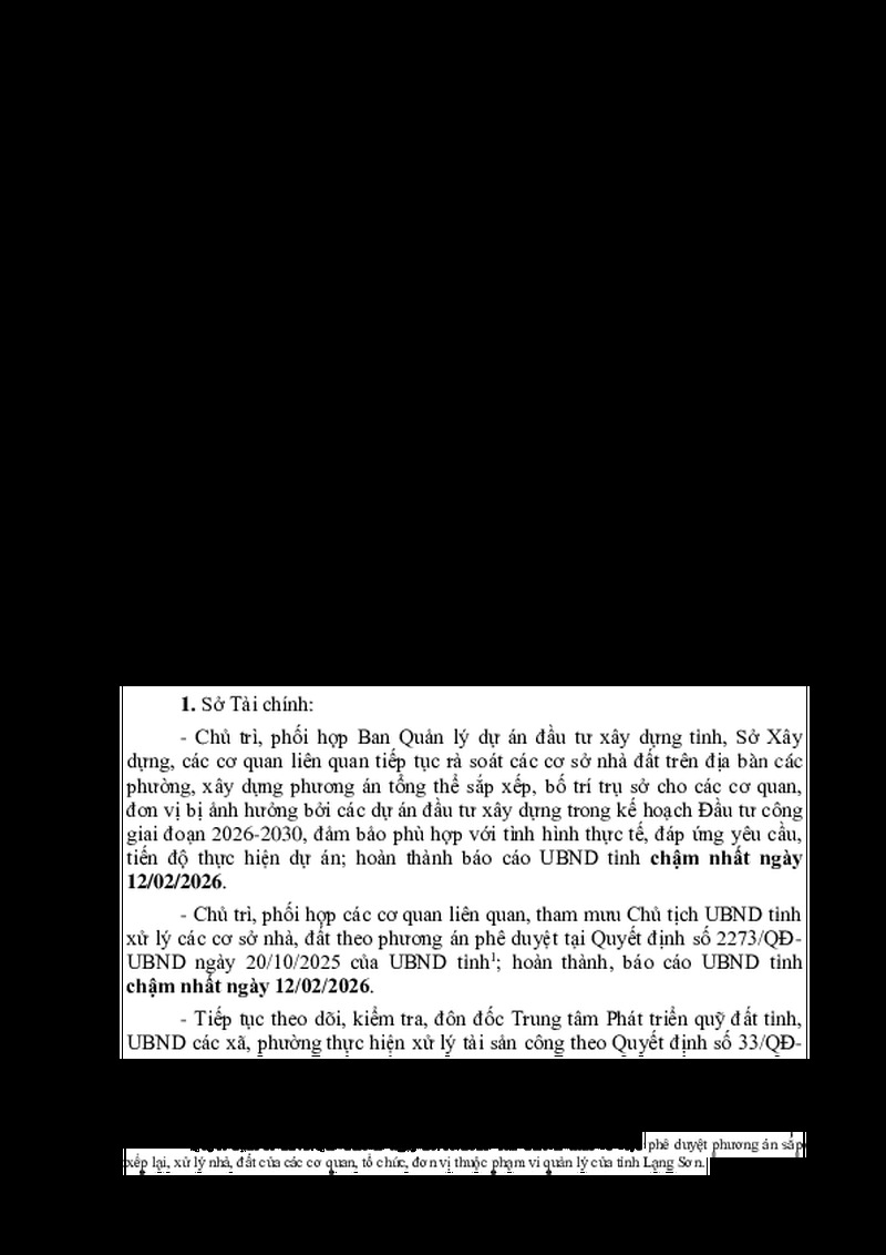 | Tiêu đề văn bản | Thông báo Kết luận của đồng chí Đoàn Thanh Sơn, Phó Chủ tịch UBND tỉnh tại cuộc họp chuyên đề xem xét tình hình quản lý, sử dụng, xử lý tài sản công là các cơ sở nhà, đất trên địa bàn các phường sau khi sắp xếp, tổ chức lại chính quyền địa phương 02 cấp | ||