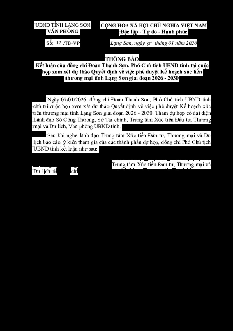 | Tiêu đề văn bản | Thông báo kết luận của đồng chí Đoàn Thanh Sơn, Phó Chủ tịch UBND tỉnh tại cuộc họp xem xét dự thảo Quyết định về việc phê duyệt Kế hoạch xúc tiến thương mại tỉnh Lạng Sơn giai đoạn 2026 - 2030 | ||