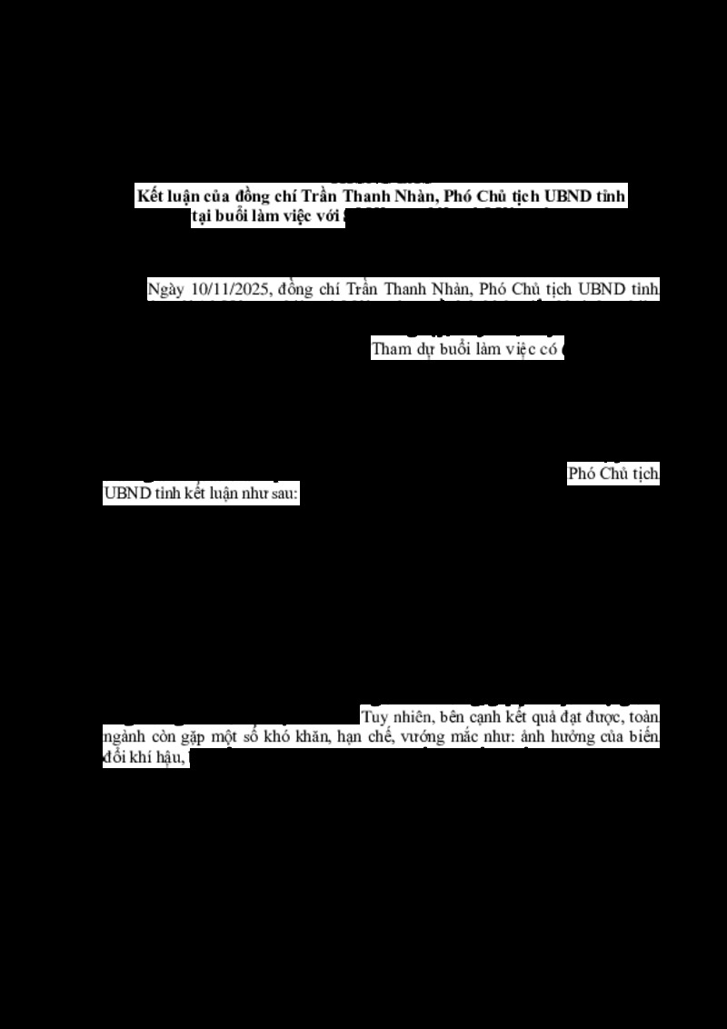 | Tiêu đề văn bản | Thông báo Kết luận của đồng chí Trần Thanh Nhàn, Phó Chủ tịch UBND tỉnh tại buổi làm việc với Sở Nông nghiệp và Môi trường | ||