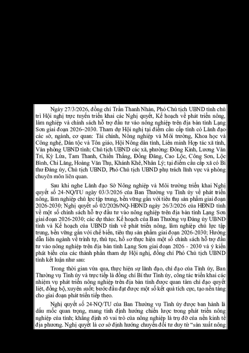 | Tiêu đề văn bản | Thông báo Kết luận của đồng chí Trần Thanh Nhàn, Phó Chủ tịch UBND tỉnh tại Hội nghị trực tuyến triển khai các Nghị quyết, Kế hoạch về Phát triển nông, lâm nghiệp và chính sách hỗ trợ đầu tư vào nông nghiệp trên địa bàn tỉnh Lạng Sơn giai đoạn 2026-2030 | ||