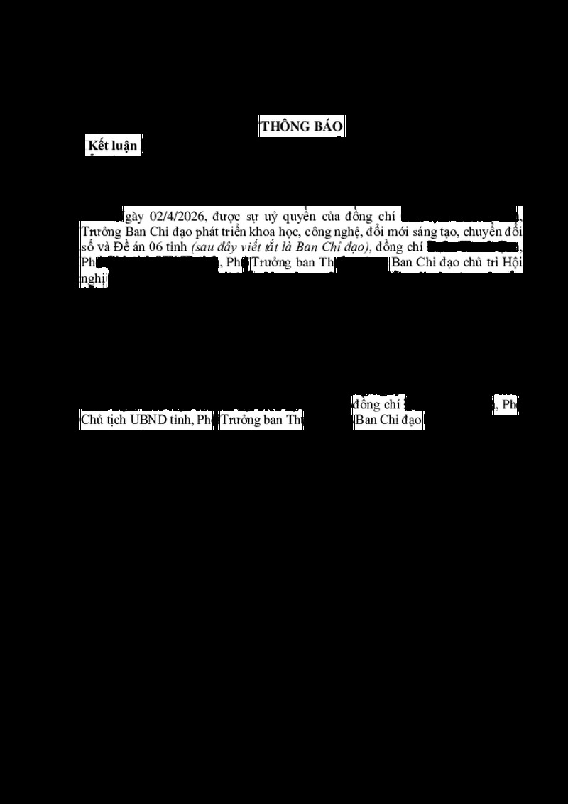 | Tiêu đề văn bản | Thông báo kết luận Hội nghị đánh giá công tác phát triển khoa học, công nghệ, đổi mới sáng tạo, chuyển đổi số, cải cách hành chính và Đề án 06 trên địa bàn tỉnh quý I năm 2026; phương hướng, nhiệm vụ quý II năm 2026 | ||
