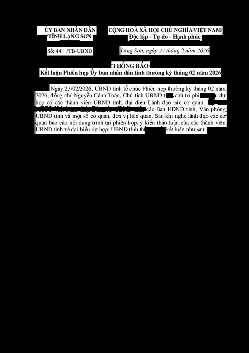 | Tiêu đề văn bản | Thông báo Kết luận Phiên họp Ủy ban nhân dân tỉnh thường kỳ tháng 02 năm 2026 | ||