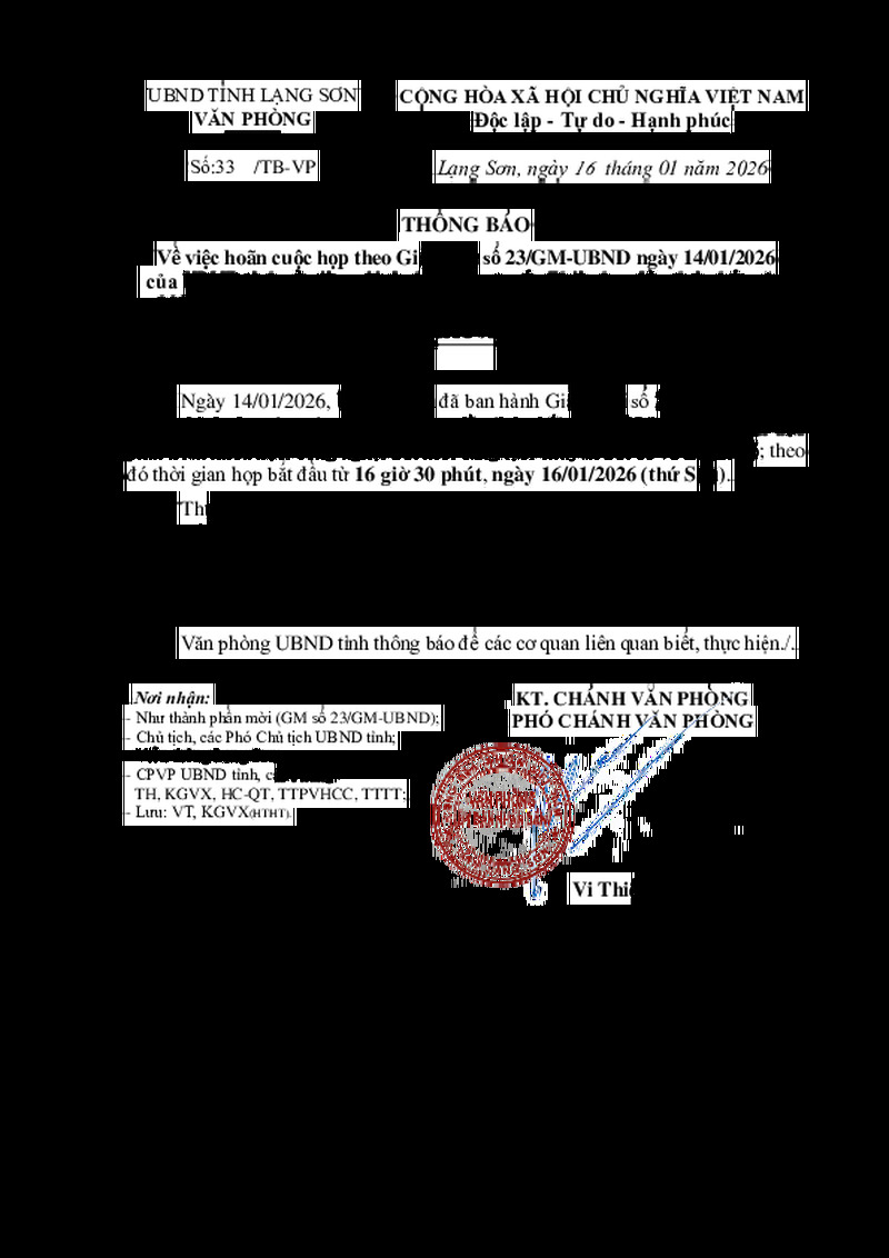 | Tiêu đề văn bản | Thông báo về việc hoãn cuộc họp theo Giấy mời số 23/GM-UBND ngày 14/01/2026 của UBND tỉnh về việc mời dự họp trực tuyến Phiên họp lần thứ nhất năm 2026 của Ban Chỉ đạo phát triển khoa học, công nghệ, đổi mới sáng tạo, chuyển đổi số và Đề án 06 | ||