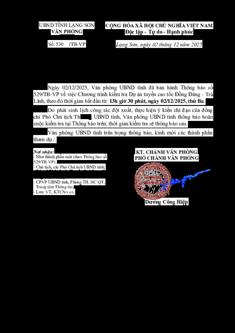 | Tiêu đề văn bản | Thông báo Hoãn kiểm tra Dự án tuyến cao tốc Đồng Đăng - Trà Lĩnh (tại Thông báo số 529/TB-VP ngày 02/12/2025) | ||