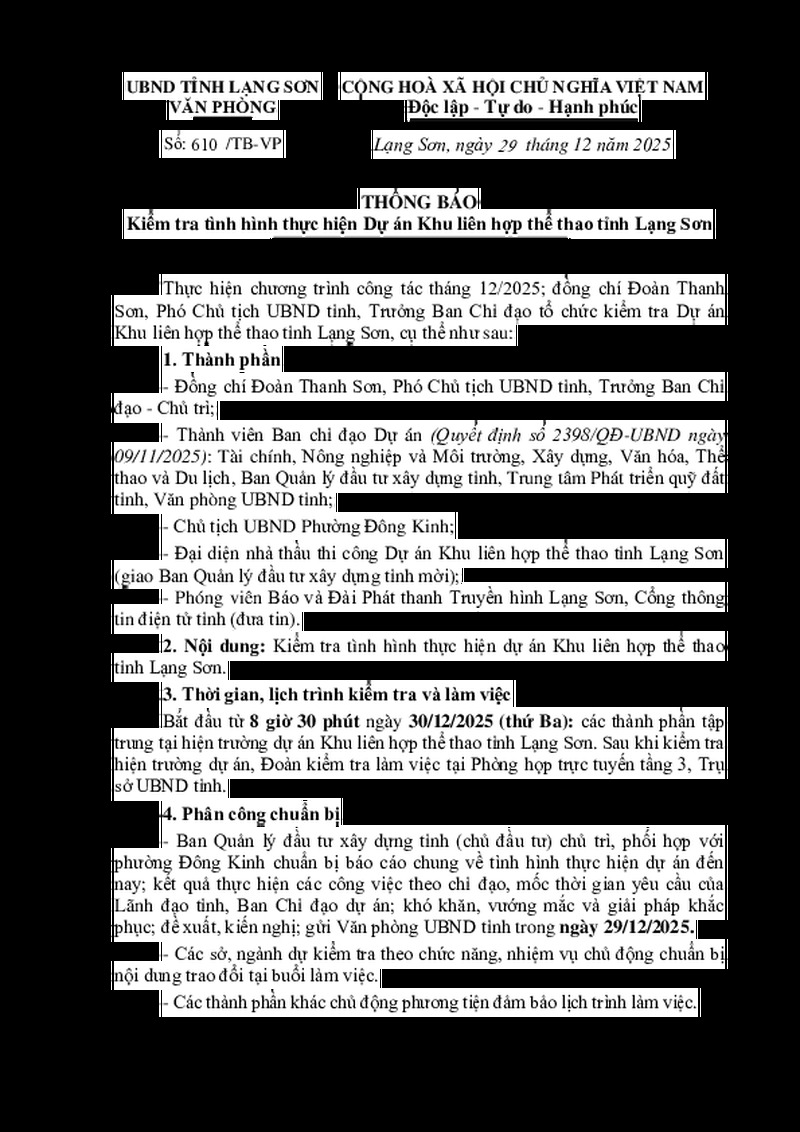 | Tiêu đề văn bản | Thông báo kiểm tra tình hình thực hiện Dự án Khu liên hợp thể thao tỉnh Lạng Sơn | ||
