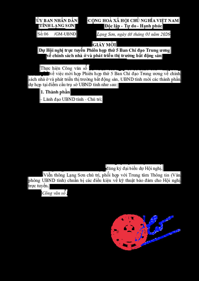 | Tiêu đề văn bản | Giấy mời Dự Hội nghị trực tuyến Phiên họp thứ 5 Ban Chỉ đạo Trung ương về chính sách nhà ở và phát triển thị trường bất động sản | ||