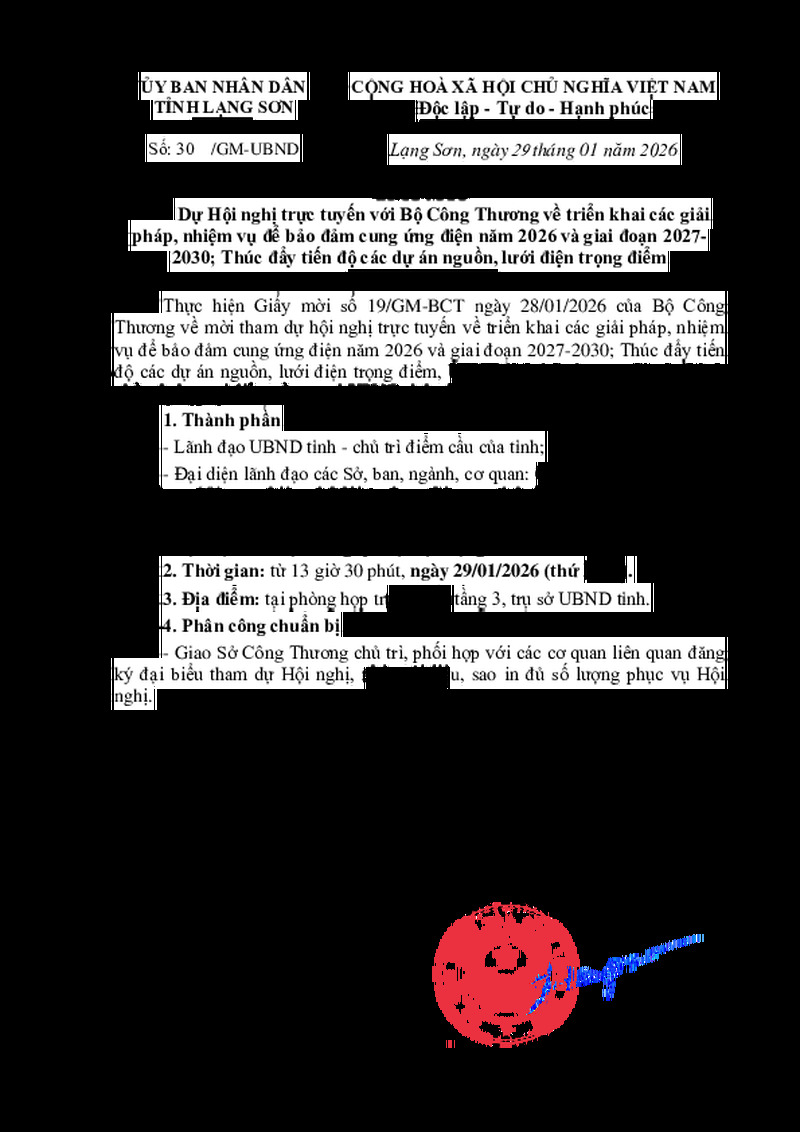 | Tiêu đề văn bản | Giấy mời Dự Hội nghị trực tuyến với Bộ Công Thương về triển khai các giải pháp, nhiệm vụ để bảo đảm cung ứng điện năm 2026 và giai đoạn 2027-2030; Thúc đẩy tiến độ các dự án nguồn, lưới điện trọng điểm | ||