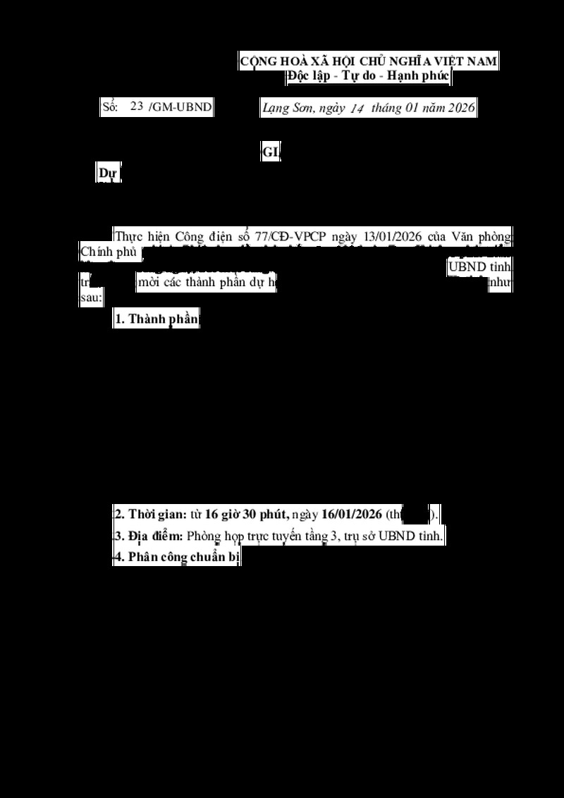 | Tiêu đề văn bản | Giấy mời Dự họp trực tuyến Phiên họp lần thứ nhất năm 2026 của Ban Chỉ đạo phát triển khoa học, công nghệ, đổi mới sáng tạo, chuyển đổi số và Đề án 06 | ||