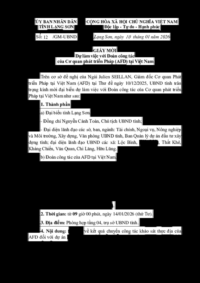 | Tiêu đề văn bản | Giấy mời Dự làm việc với Đoàn công tác của Cơ quan phát triển Pháp (AFD) tại Việt Nam | ||
