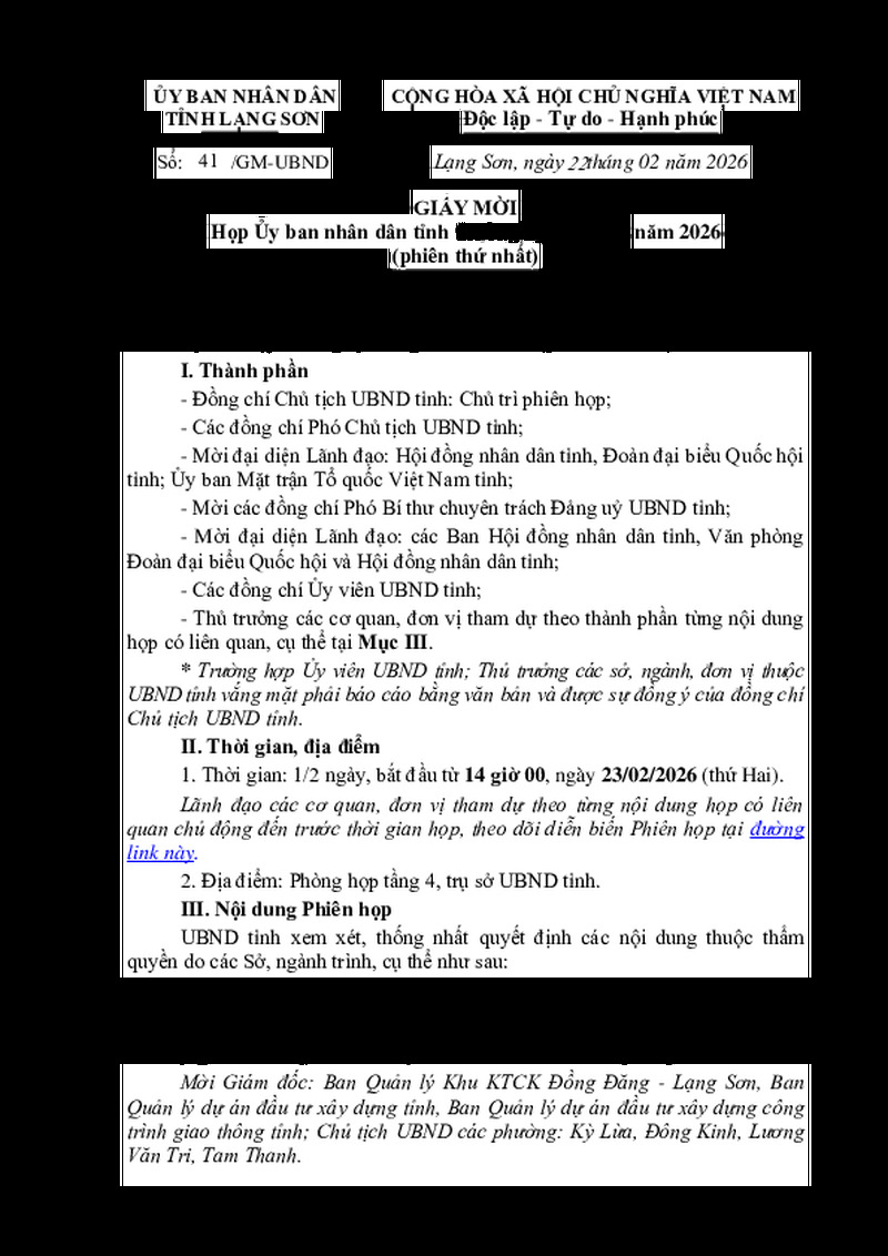 | Tiêu đề văn bản | Giấy mời Họp Ủy ban nhân dân tỉnh thường kỳ tháng 02 năm 2026 (phiên thứ nhất) | ||