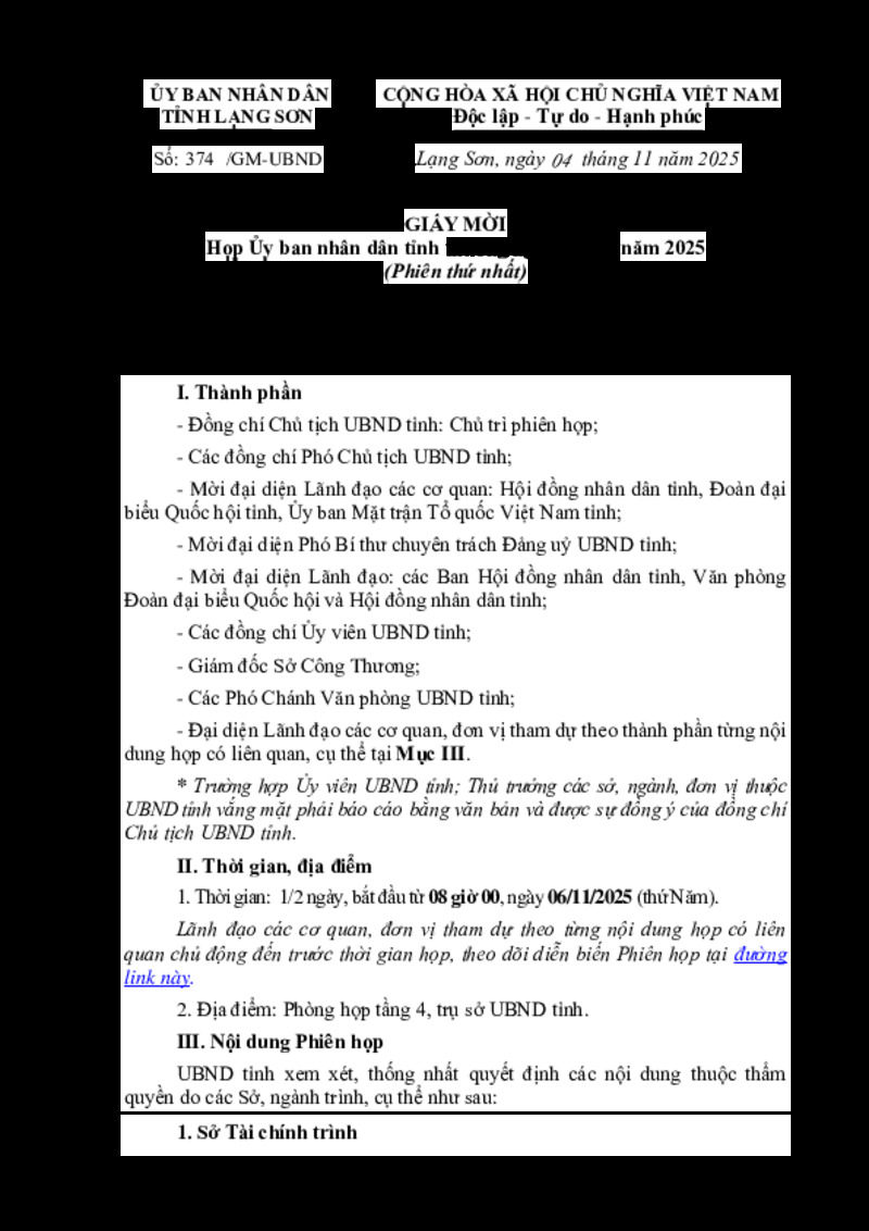 | Tiêu đề văn bản | Giấy mời Họp Ủy ban nhân dân tỉnh thường kỳ tháng 11 năm 2025 (Phiên thứ nhất) | ||
