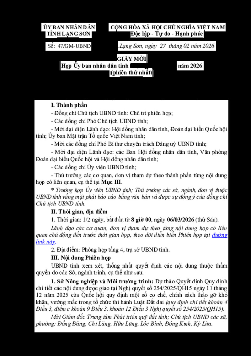 | Tiêu đề văn bản | Giấy mời họp Ủy ban nhân dân tỉnh thường kỳ tháng 3 năm 2026 (phiên thứ nhất) | ||