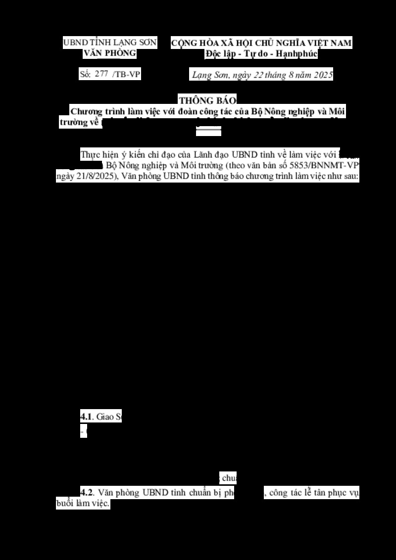 Tiêu đề văn bản | Thông báo Chương trình làm việc với đoàn công tác của Bộ Nông nghiệp và Môi trường về một số nội dung trong vận hành chính quyền địa phương 02 cấp | ||