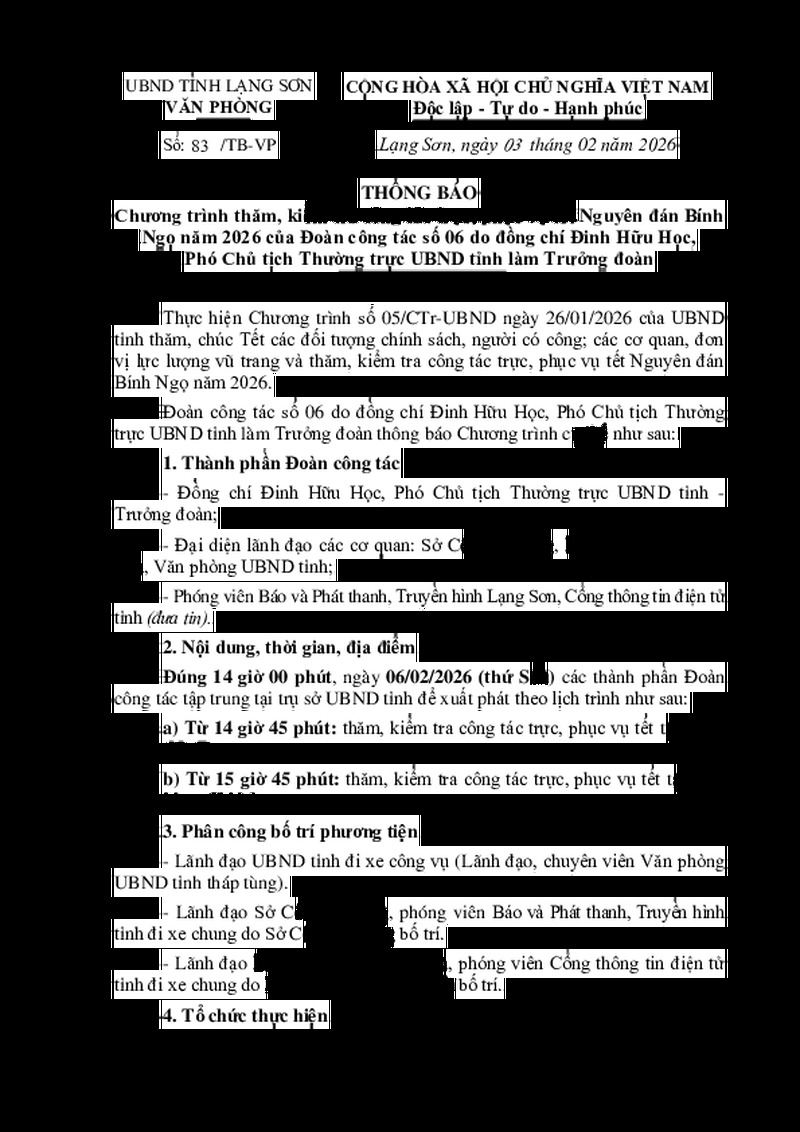 | Tiêu đề văn bản | Thông báo Chương trình thăm, kiểm tra công tác trực, phục vụ tết Nguyên đán Bính Ngọ năm 2026 của Đoàn công tác số 06 do đồng chí Đinh Hữu Học, Phó Chủ tịch Thường trực UBND tỉnh làm Trưởng đoàn | ||