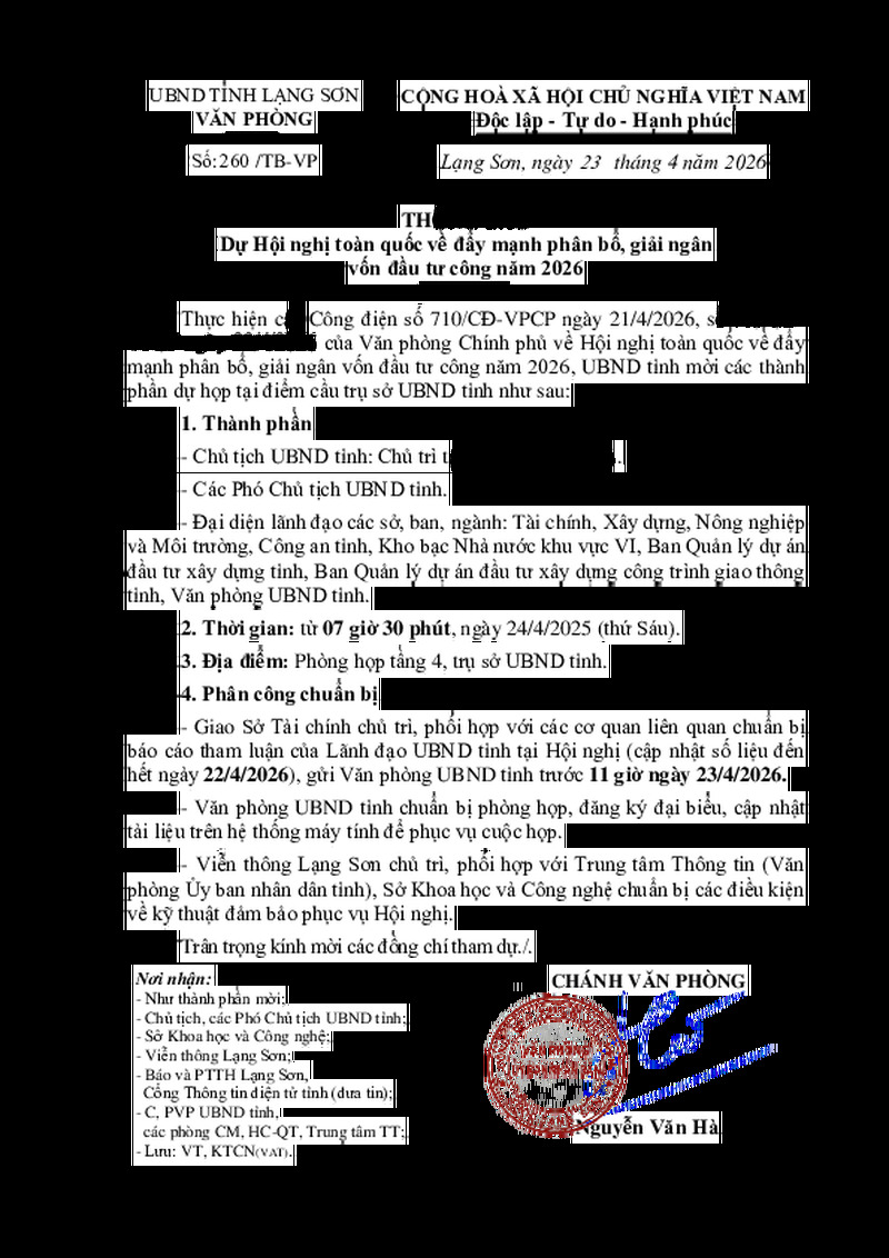 | Tiêu đề văn bản | Thông báo Dự Hội nghị toàn quốc về đẩy mạnh phân bổ, giải ngân vốn đầu tư công năm 2026 | ||