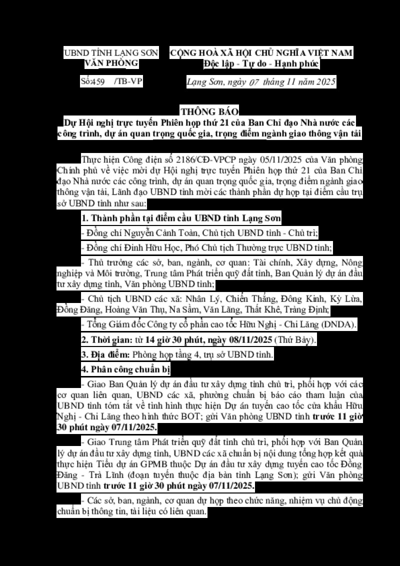 | Tiêu đề văn bản | Thông báo Dự Hội nghị trực tuyến Phiên họp thứ 21 của Ban Chỉ đạo Nhà nước các công trình, dự án quan trọng quốc gia, trọng điểm ngành giao thông vận tải | ||