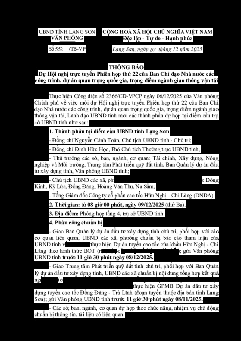 | Tiêu đề văn bản | Thông báo Dự Hội nghị trực tuyến Phiên họp thứ 22 của Ban Chỉ đạo Nhà nước các công trình, dự án quan trọng quốc gia, trọng điểm ngành giao thông vận tải | ||