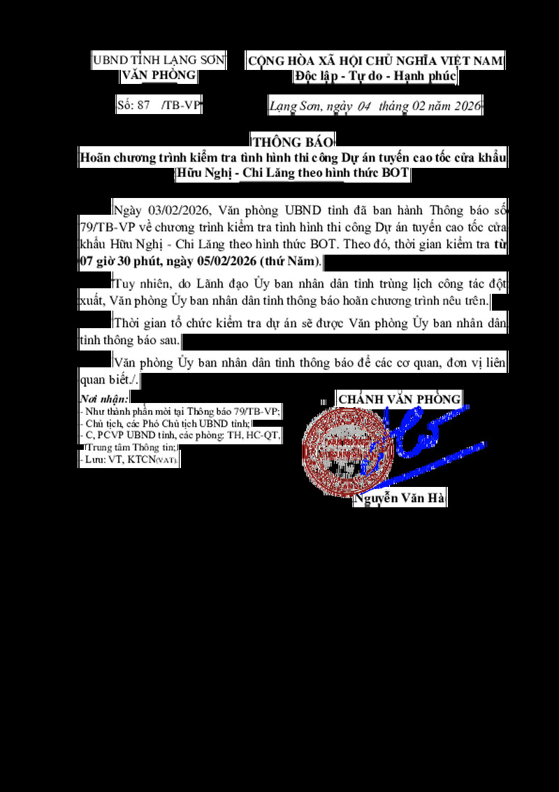 | Tiêu đề văn bản | Thông báo hoãn chương trình kiểm tra tình hình thi công Dự án tuyến cao tốc cửa khẩu Hữu Nghị - Chi Lăng theo hình thức BOT | ||