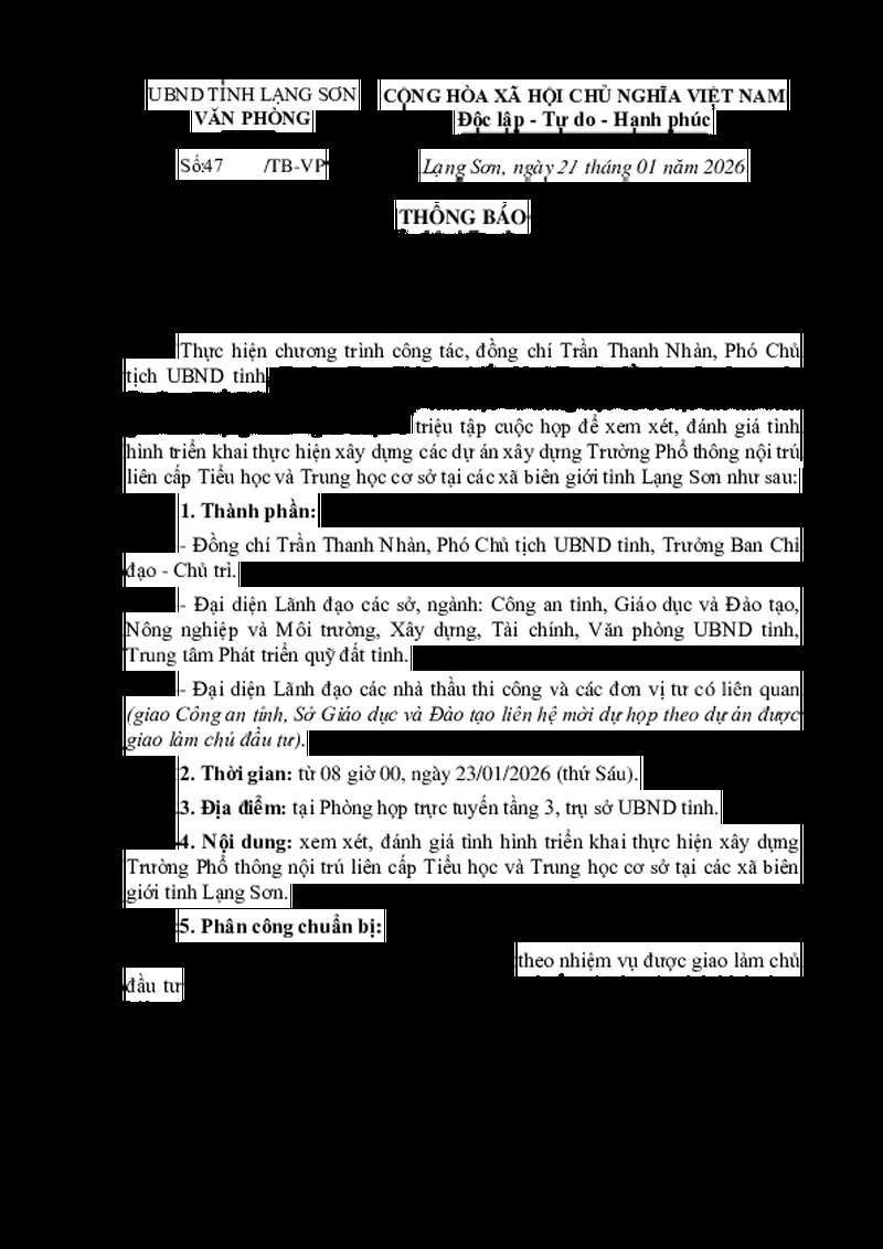 | Tiêu đề văn bản | Thông báo họp Ban Chỉ đạo triển khai Dự án đầu tư xây dựng các Trường Phổ thông nội trú liên cấp tiểu học và trung học cơ sở tại các xãbiên giới tỉnh Lạng Sơn | ||