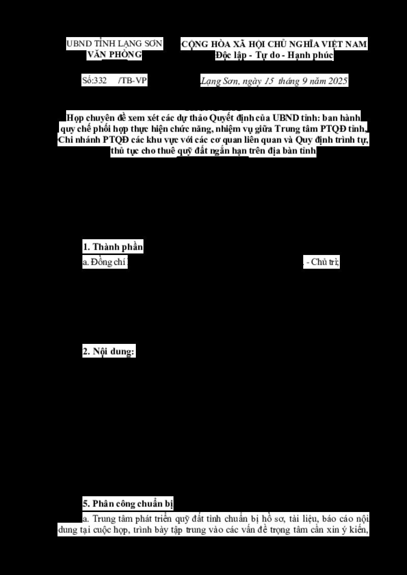 Tiêu đề văn bản | Thông báo họp chuyên đề xem xét các dự thảo Quyết định của UBND tỉnh: ban hành quy chế phối hợp thực hiện chức năng, nhiệm vụ giữa Trung tâm PTQĐ tỉnh, Chi nhánh PTQĐ các khu vực với các cơ quan liên quan và Quy định trình tự, thủ tục cho thuê quỹ đất ngắn hạn trên địa bàn tỉnh | ||