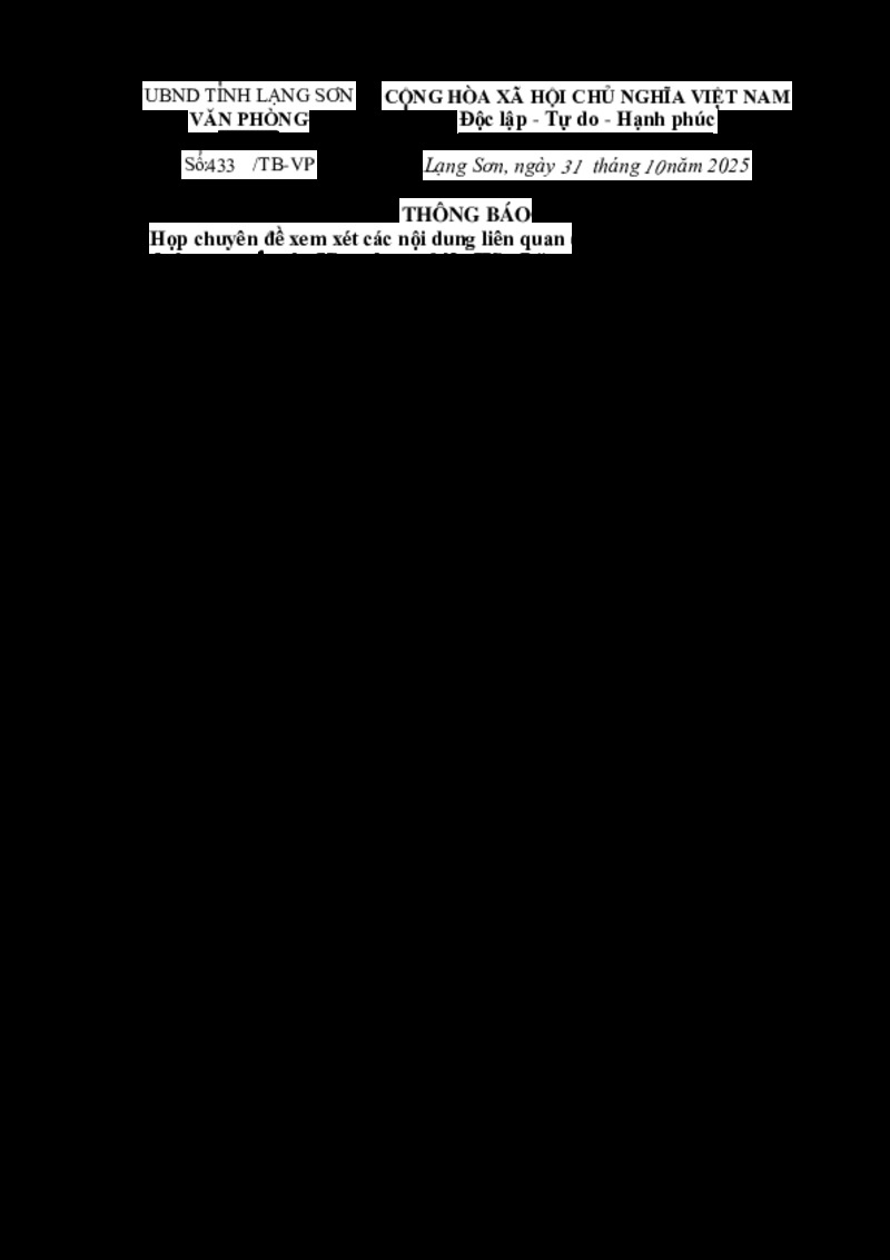 | Tiêu đề văn bản | Thông báo họp chuyên đề xem xét các nội dung liên quan đến các dự án: Nút giao đường cao tốc vào Khu công nghiệp Hữu Lũng, Khu công nghiệp VSIP Lạng Sơn; xem xét nội dung điều chỉnh dự án Thủy điện Tràng Định 2 | ||