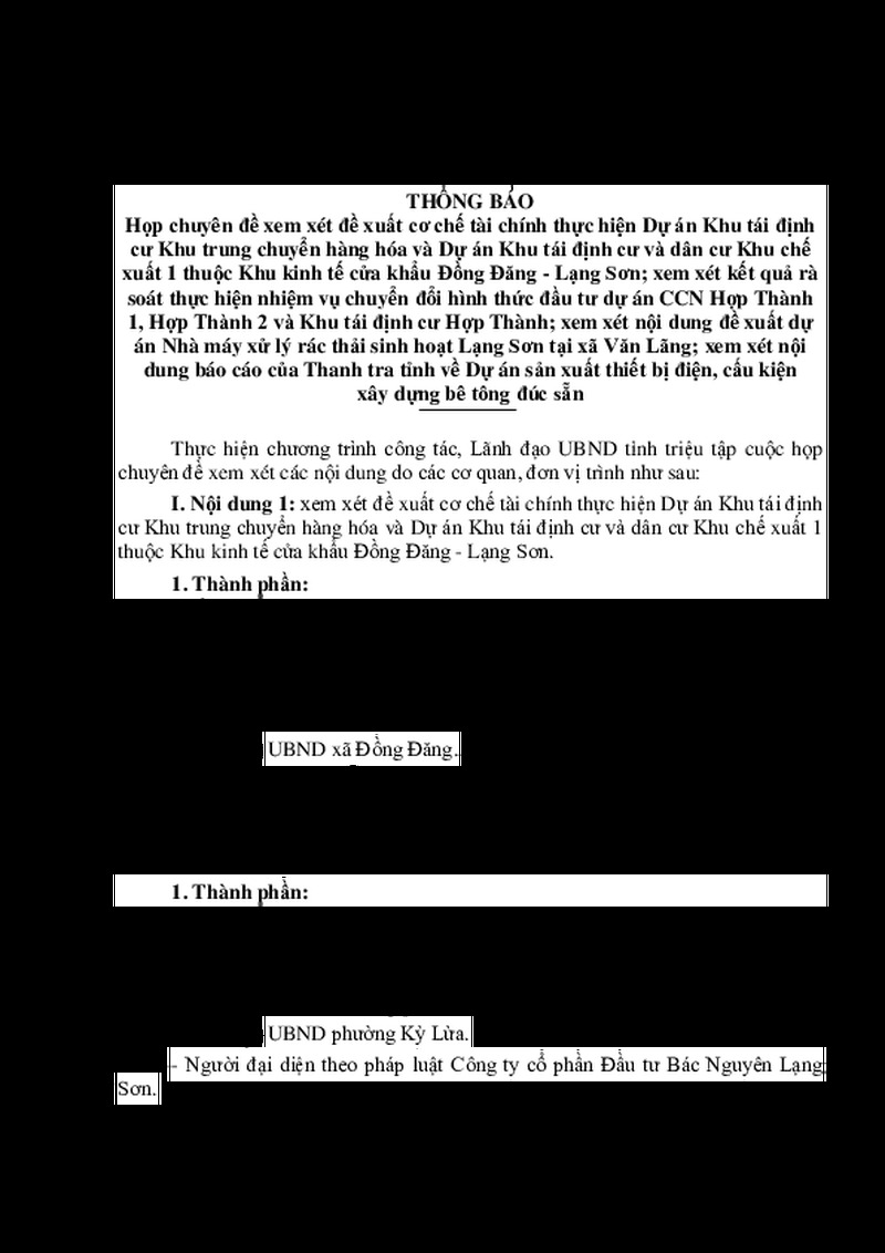 | Tiêu đề văn bản | Thông báo họp chuyên đề xem xét đề xuất cơ chế tài chính thực hiện Dự án Khu tái định cư Khu trung chuyển hàng hóa và Dự án Khu tái định cư và dân cư Khu chế xuất 1 thuộc Khu kinh tế cửa khẩu Đồng Đăng - Lạng Sơn; xem xét kết quả rà soát thực hiện nhiệm vụ chuyển đổi hình thức đầu tư dự án CCN Hợp Thành 1, Hợp Thành 2 và Khu tái định cư Hợp Thành; xem xét nội dung đề xuất dự án Nhà máy xử lý rác thải sinh hoạt Lạng Sơn tại xã Văn Lãng; xem xét nội dung báo cáo của Thanh tra tỉnh về Dự án sản xuất thiết bị điện, cấu kiện xây dựng bê tông đúc sẵn | ||