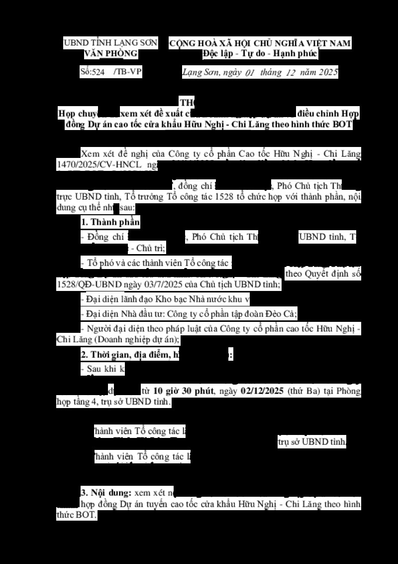 | Tiêu đề văn bản | Thông báo họp chuyên đề xem xét đề xuất của Doanh nghiệp dự án về điều chỉnh Hợp đồng Dự án cao tốc cửa khẩu Hữu Nghị - Chi Lăng theo hình thức BOT | ||