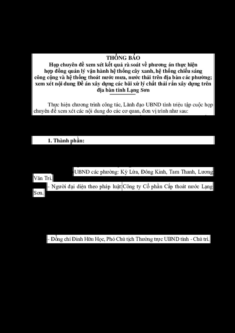 | Tiêu đề văn bản | Thông báo Họp chuyên đề xem xét kết quả rà soát về phương án thực hiện hợp đồng quản lý vận hành hệ thống cây xanh, hệ thống chiếu sáng công cộng và hệ thống thoát nước mưa, nước thải trên địa bàn các phường; xem xét nội dung Đề án xây dựng các bãi xử lý chất thải rắn xây dựng trên địa bàn tỉnh Lạng Sơn | ||