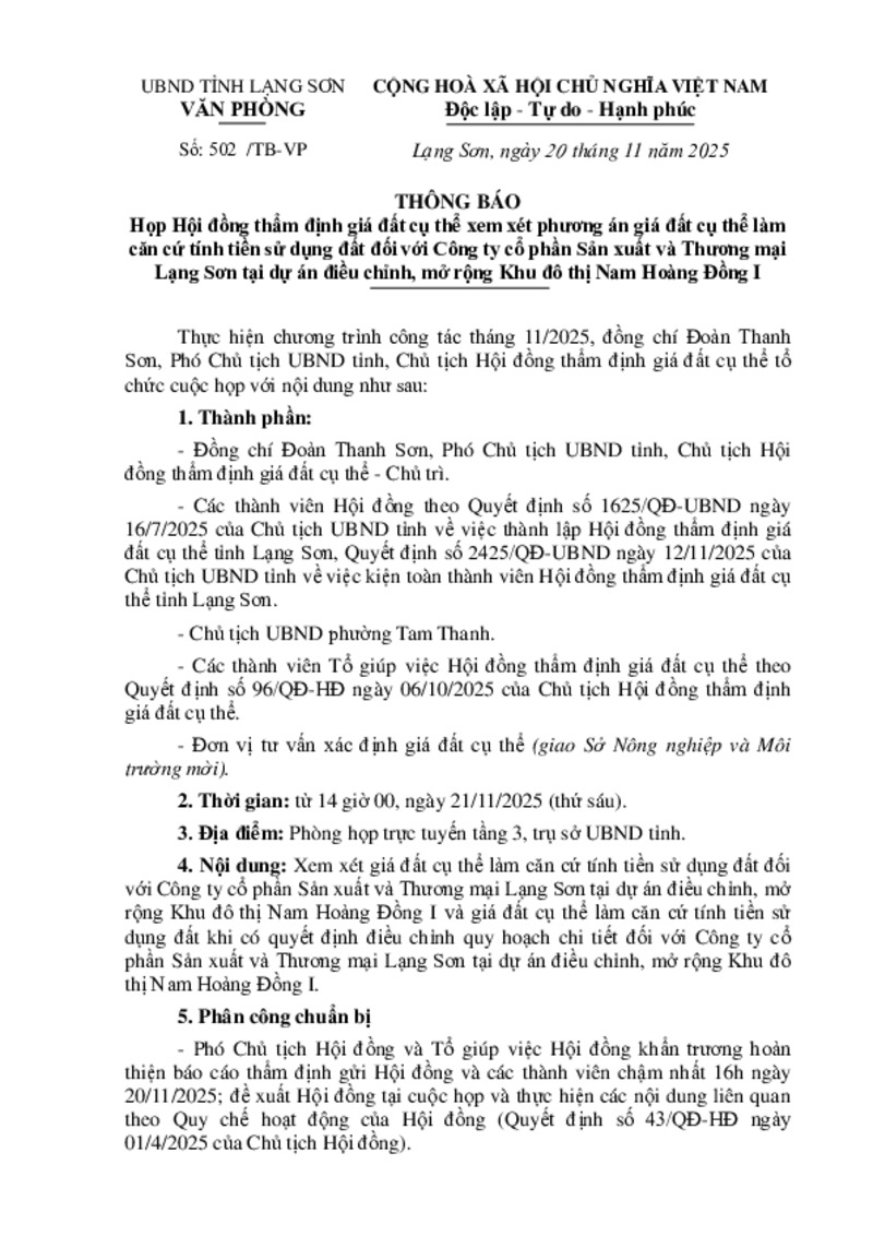 | Tiêu đề văn bản | Thông báo Họp Hội đồng thẩm định giá đất cụ thể xem xét phương án giá đất cụ thể làm căn cứ tính tiền sử dụng đất đối với Công ty cổ phần Sản xuất và Thương mại Lạng Sơn tại dự án điều chỉnh, mở rộng Khu đô thị Nam Hoàng Đồng I | ||