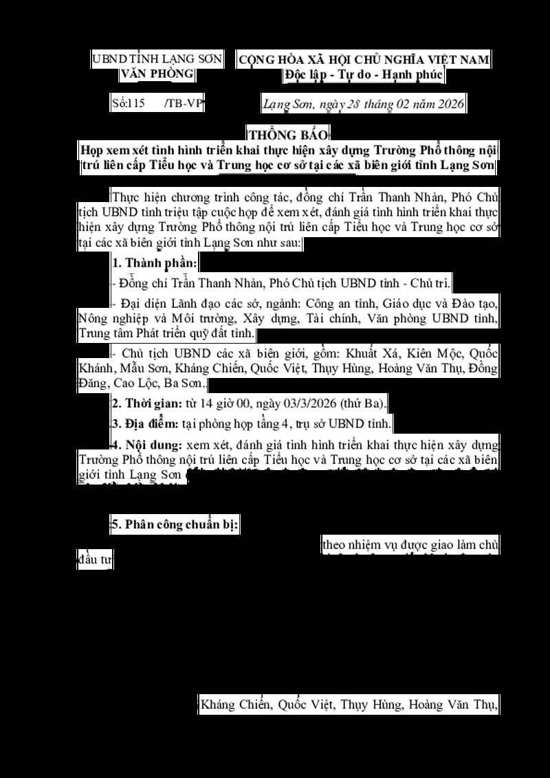 | Tiêu đề văn bản | Thông báo họp xem xét tình hình triển khai thực hiện xây dựng Trường Phổ thông nội trú liên cấp Tiểu học và Trung học cơ sở tại các xã biên giới tỉnh Lạng Sơn | ||