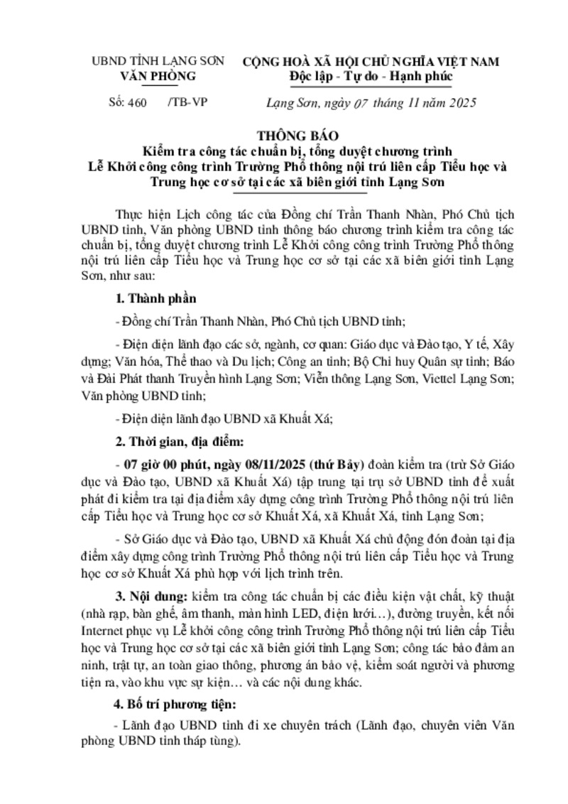 | Tiêu đề văn bản | Thông báo Kiểm tra công tác chuẩn bị, tổng duyệt chương trình Lễ Khởi công công trình Trường Phổ thông nội trú liên cấp Tiểu học và Trung học cơ sở tại các xã biên giới tỉnh Lạng Sơn | ||