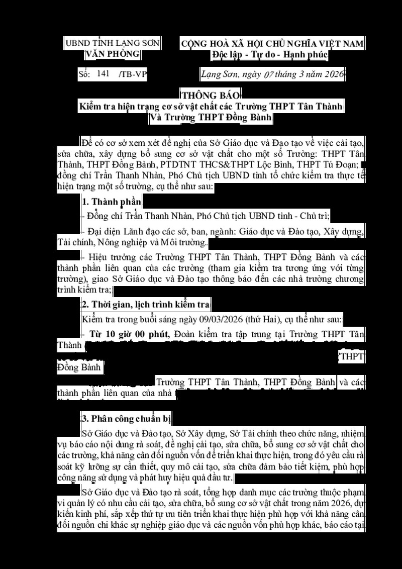 | Tiêu đề văn bản | Thông báo kiểm tra hiện trạng cơ sở vật chất các Trường THPT Tân Thành và Trường THPT Đồng Bành | ||