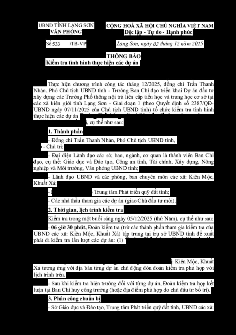 | Tiêu đề văn bản | Thông báo kiểm tra tình hình thực hiện các dự án Trường Phổ thông nội trú liên cấp tiểu học và trung học cơ sở Kiên Mộc, Khuất Xá | ||