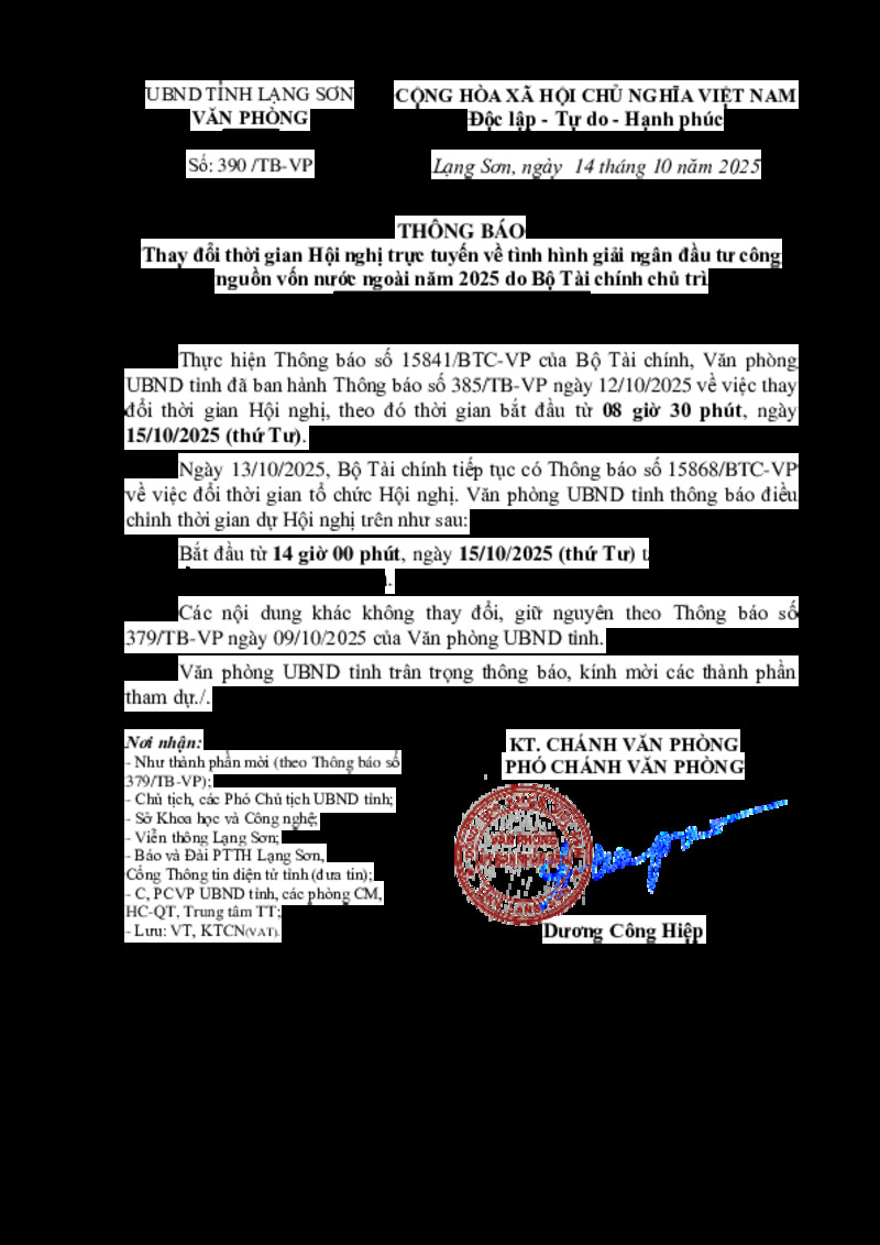 Tiêu đề văn bản | Thông báo thay đổi thời gian Hội nghị trực tuyến về tình hình giải ngân đầu tư công nguồn vốn nước ngoài năm 2025 do Bộ Tài chính chủ trì | ||