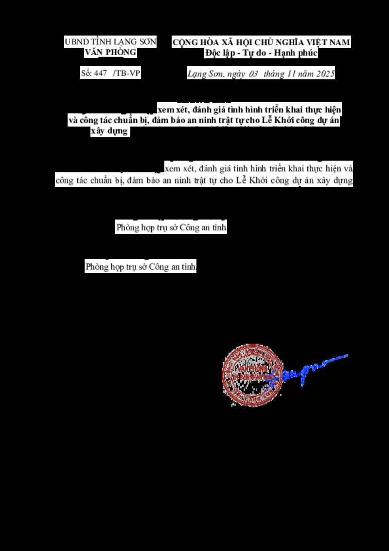 | Tiêu đề văn bản | Thông báo thay đổi thời gian họp xem xét, đánh giá tình hình triển khai thực hiện và công tác chuẩn bị, đảm bảo an ninh trật tự cho Lễ Khởi công dự án xây dựng trường học cho các xã biên giới trên địa bàn tỉnh | ||
