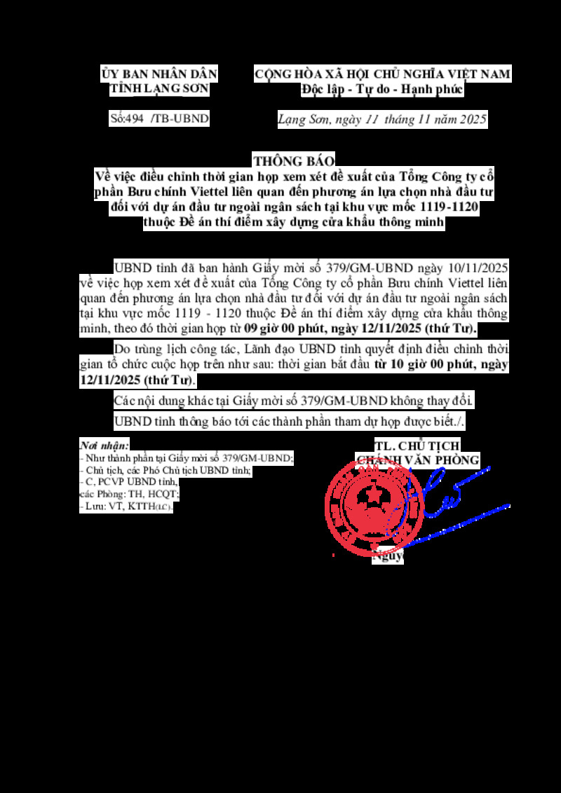 | Tiêu đề văn bản | Thông báo về việc điều chỉnh thời gian họp xem xét đề xuất của Tổng Công ty cổ phần Bưu chính Viettel liên quan đến phương án lựa chọn nhà đầu tư đối với dự án đầu tư ngoài ngân sách tại khu vực mốc 1119-1120 thuộc Đề án thí điểm xây dựng cửa khẩu thông minh | ||