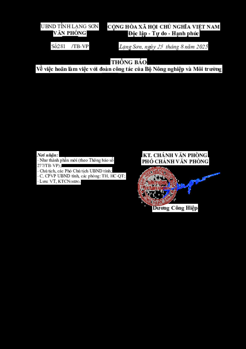 Tiêu đề văn bản | Thông báo Về việc hoãn làm việc với đoàn công tác của Bộ Nông nghiệp và Môi trường | ||