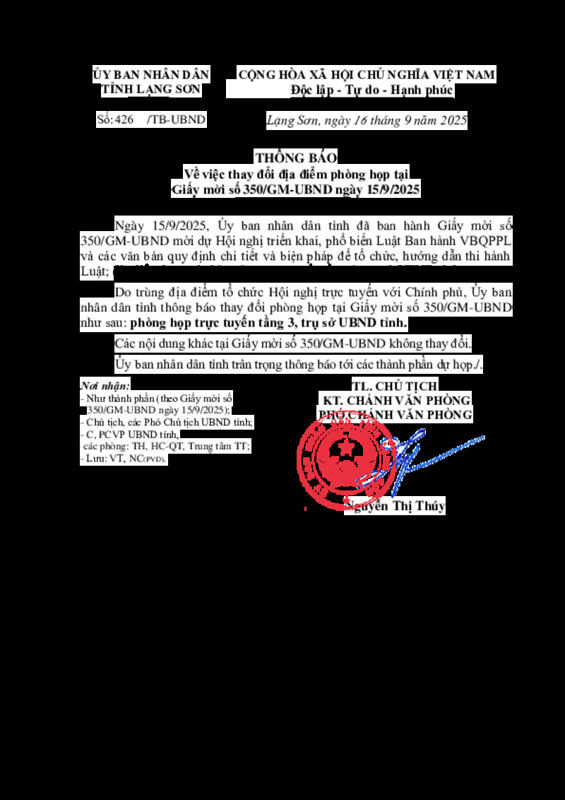 Tiêu đề văn bản | Thông báo về việc thay đổi địa điểm phòng họp tại Giấy mời số 350/GM-UBND ngày 15/9/2025 | ||