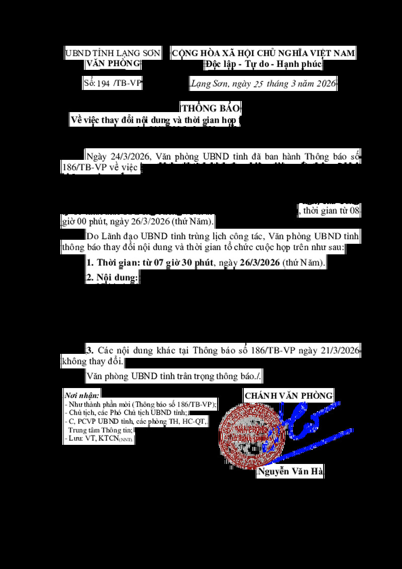 | Tiêu đề văn bản | Thông báo về việc thay đổi nội dung và thời gian họp tại Thông báo số 186/TB-VP ngày 24/3/2026 của Văn phòng UBND tỉnh | ||