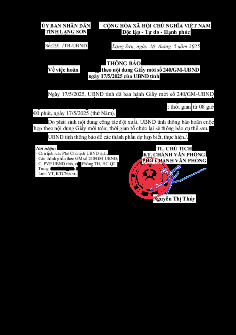 | Heading | Thông báo về việc hoãn cuộc họp theo nội dung Giấy mời số 240/GM-UBND ngày 17/5/2025 của UBND tỉnh | ||