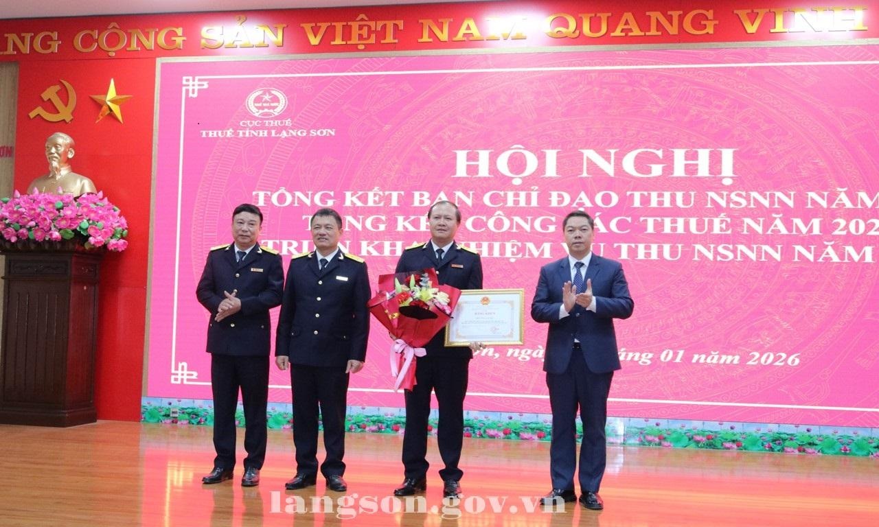 Nhân dịp này, Thuế tỉnh Lạng Sơn được nhận Bằng khen của Chủ tịch UBND tỉnh vì đã có thành tích xuất sắc trong công tác thu, nộp NSNN năm 2025, góp phần phát triển kinh tế - xã hội tỉnh, 01 cá nhân và 05 doanh nghiệp được nhận Bằng khen của Chủ tịch UBND tỉnh. Nhiều tập thể, cá nhân và doanh nghiệp được nhận Giấy khen của Cục thuế vì đã có thành tích xuất sắc trong thực hiện thu NSNN năm 2025 và có thành tích, tuân thủ chính sách, pháp luật thuế.