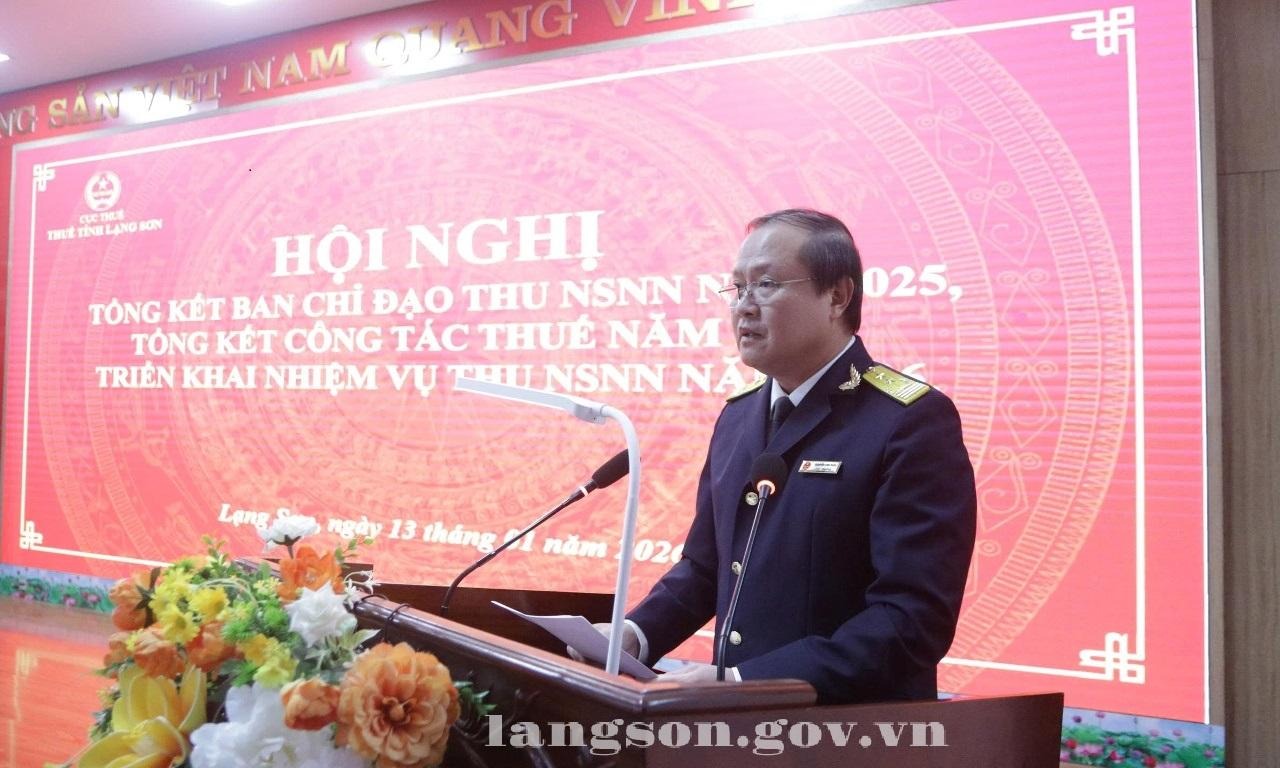 Chiều 13/01/2026, Thuế tỉnh Lạng Sơn tổ chức Hội nghị tổng kết Ban Chỉ đạo (BCĐ) thu ngân sách nhà nước (NSNN) năm 2025, tổng kết công tác thuế năm 2025 và triển khai nhiệm vụ thu NSNN năm 2026. Dự hội nghị có đồng chí Đoàn Thanh Sơn, Phó Chủ tịch UBND tỉnh, Trưởng BCĐ thu NSNN tỉnh; đồng chí Mai Sơn, Phó Cục trưởng Cục Thuế; lãnh đạo các sở, ban, ngành, một số xã, phường.